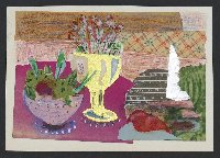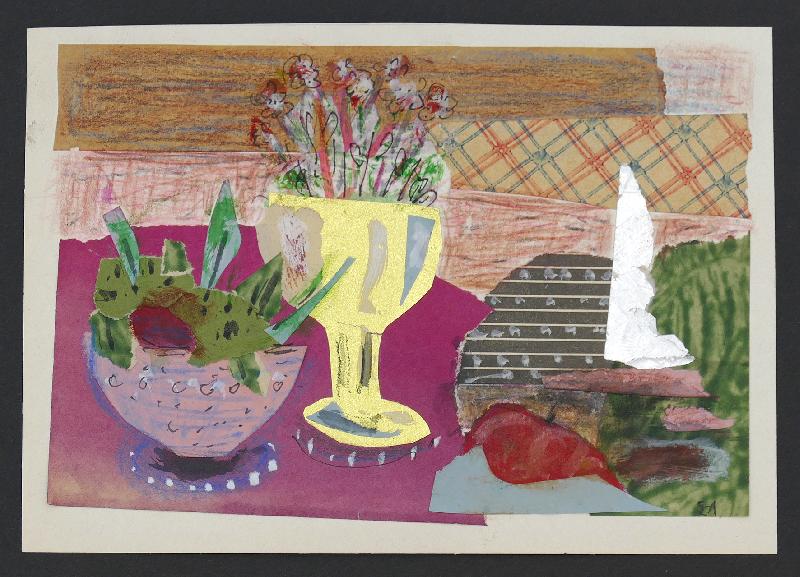 Ahnert, Elisabeth (Stilleben mit goldenem Pokal) (Collage, verschiedene Papiere, teils übermalt mit Farbstiften und Feder/Tusche, montiert auf Papier - )