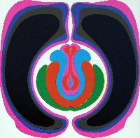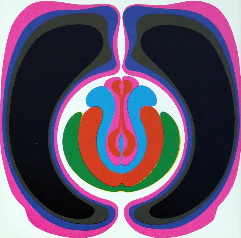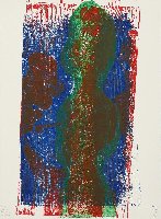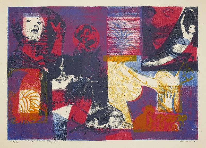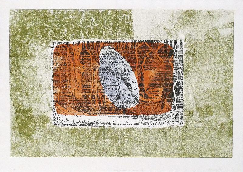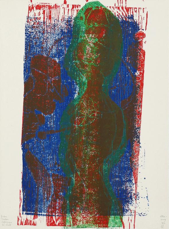 Herauftauchend aus Animas Schoß Farbholzschnitt in Olivgrün, Orange, Blau und Schwarz von vier Stöcken, 1969, 250 x 378, sign., dat., num. (7/40), betitelt, Trockenstempel des Künstlers. WV Janda H 133 2. In vorzüglichem Zustand.