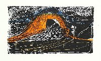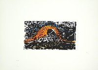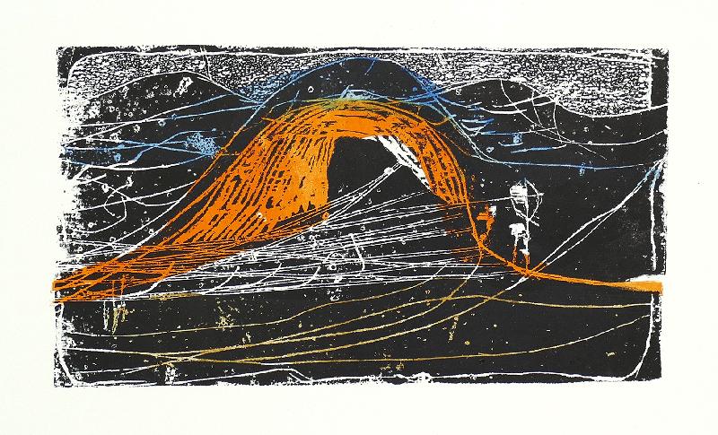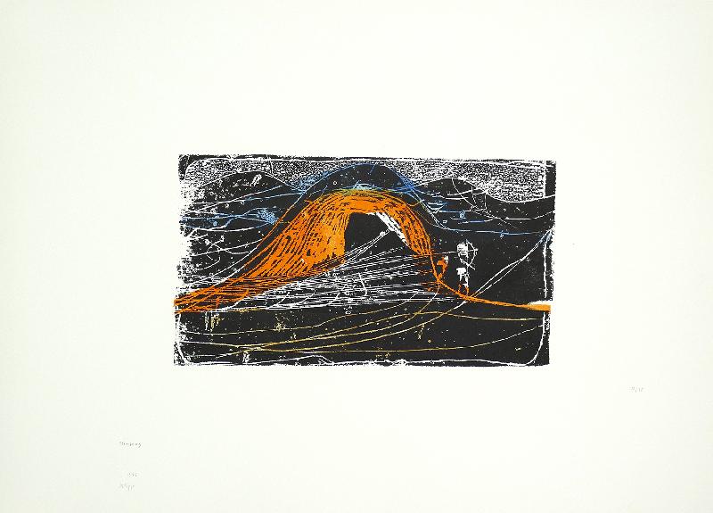 Klippe Farbholzschnitt in Schwarz, Orange, Blau und Braun von vier Stöcken auf festem Schoellers Parole Bütten, 1973, 208 x 368 (Papierformat: 508 x 725), sign., dat., num. (10/10), betitelt, Trockenstempel des Künstlers und Marke des Papierherstellers. WV Janda H 167 3. Kleine Knickspur und winziges braunes Fleckchen an der linken oberen Ecke, weit außerhalb der Darstellung.