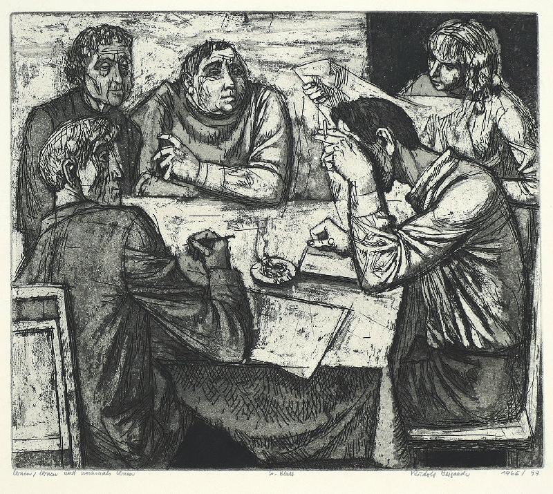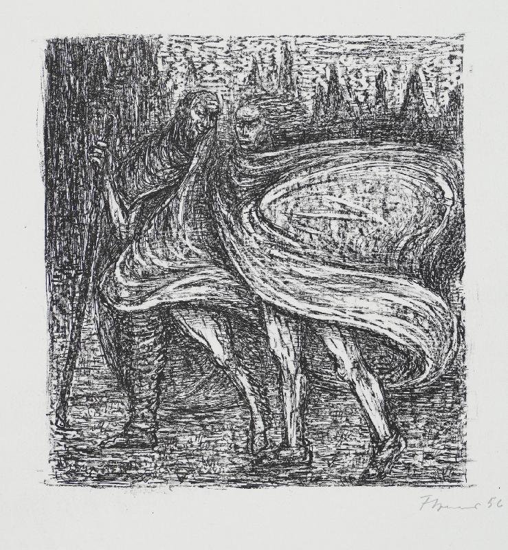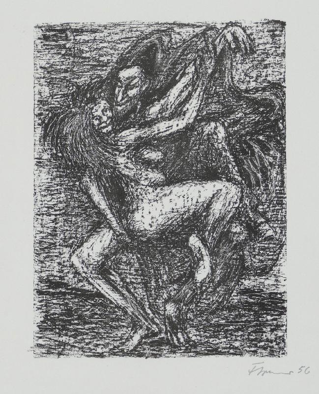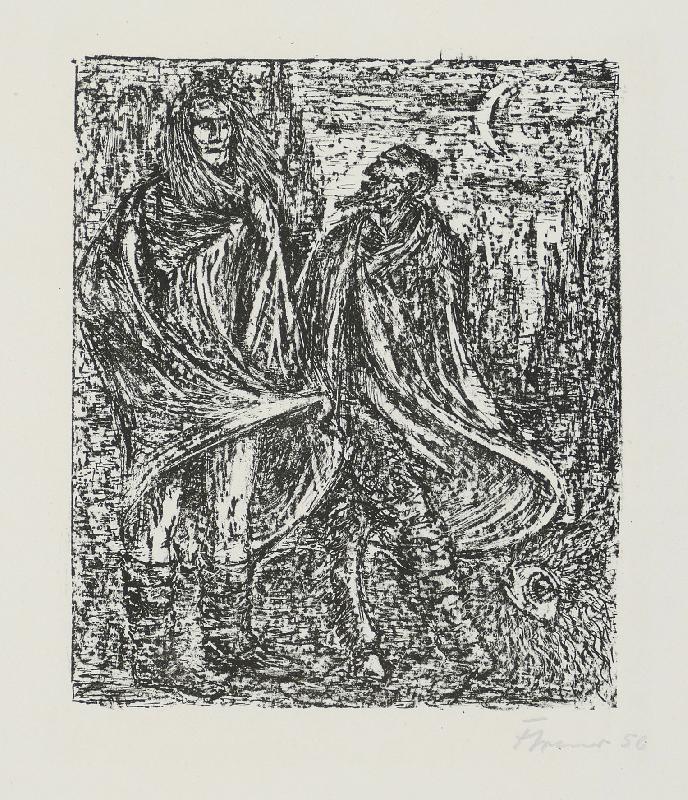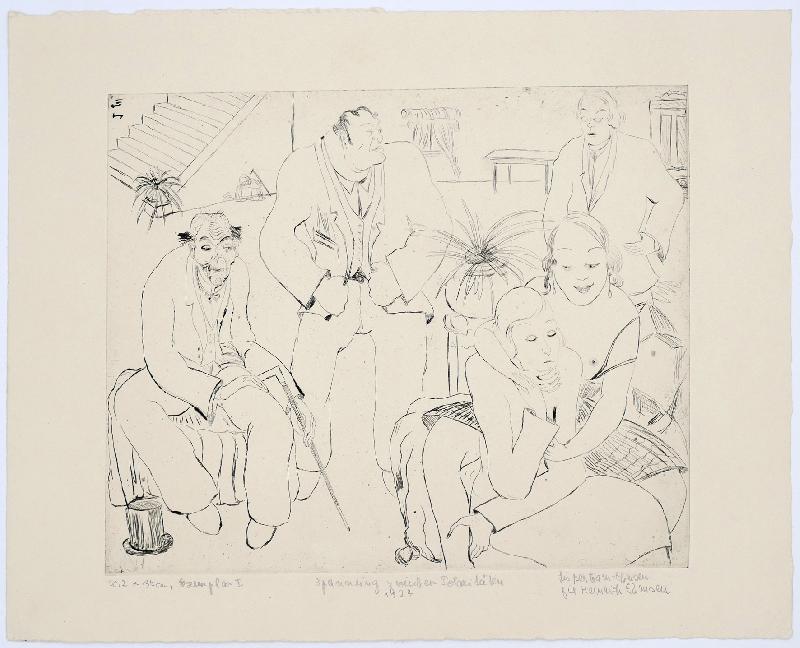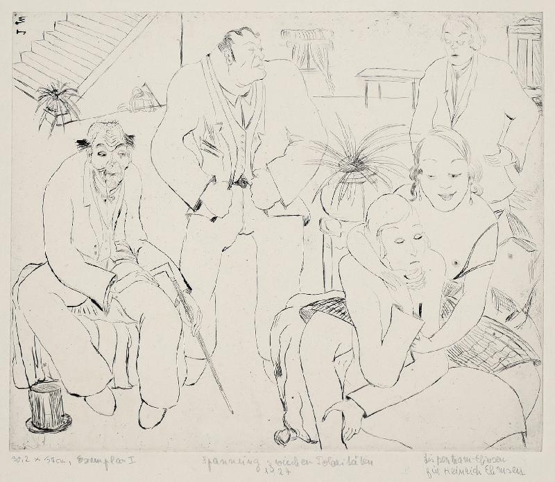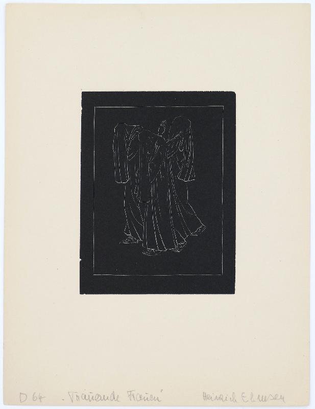 Spannung zwischen Polaritäten Kaltnadel, 1924, Druck aus dem Jahr 1964, 302 x 370, von Lis Bertram-Ehmsen sign., dat., num. (Exemplar I), bez. (Maße) und betitelt. WV Lang 51 (hier: Gesellschaft). Leichte Druckfalten an den unteren Ecken. Beigabe: Trauernde Frauen, Holzschnitt, 162 x 122, 1909/64, von Lis Bertram-Ehmsen sign., bez. (D 64), betitelt, WV Lang 22.