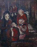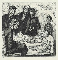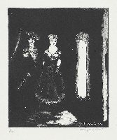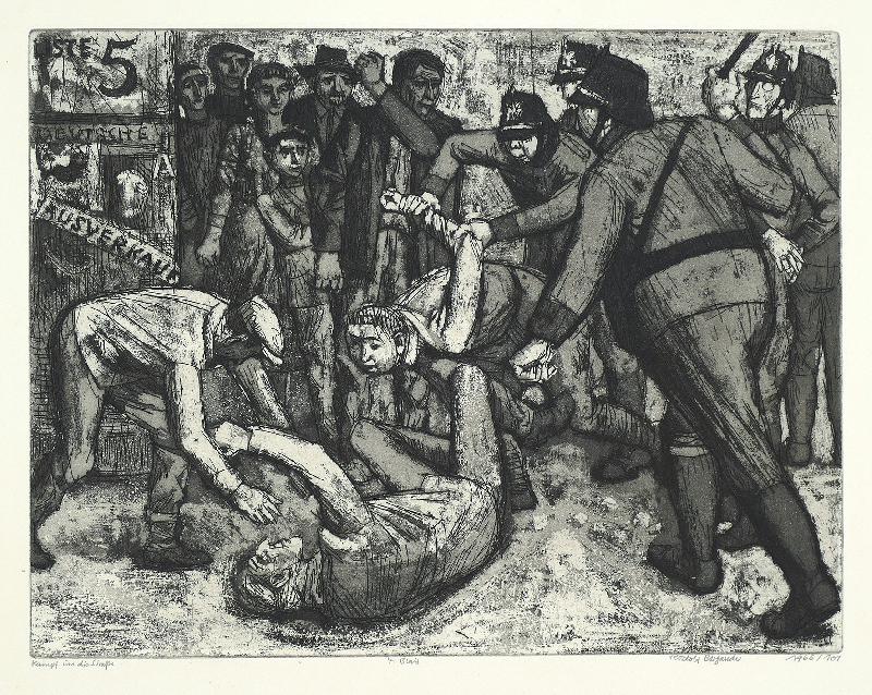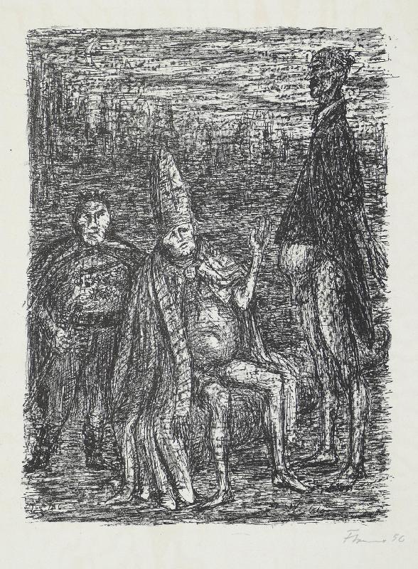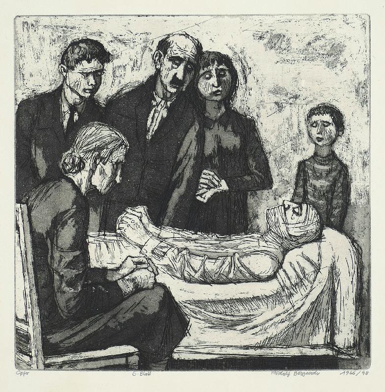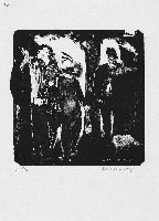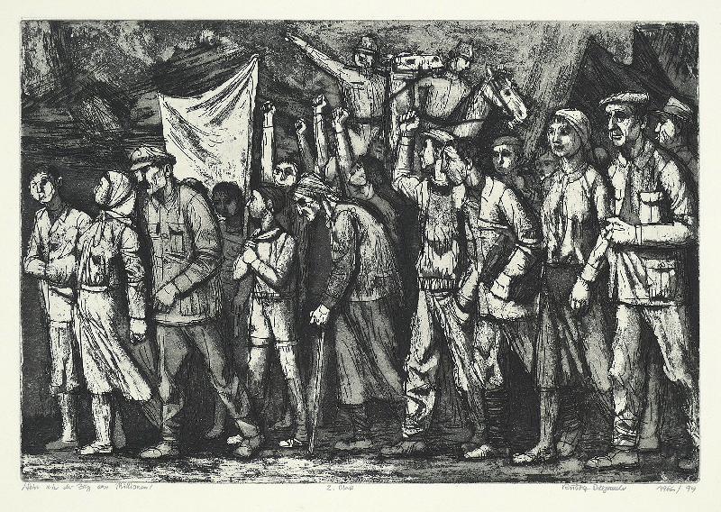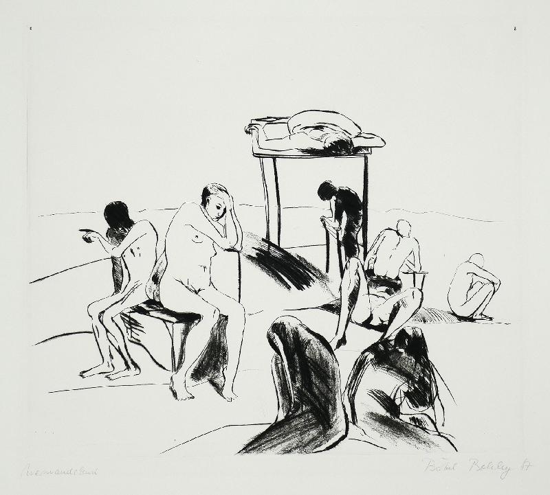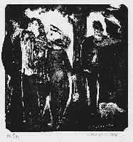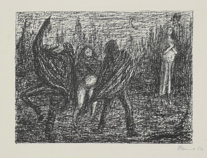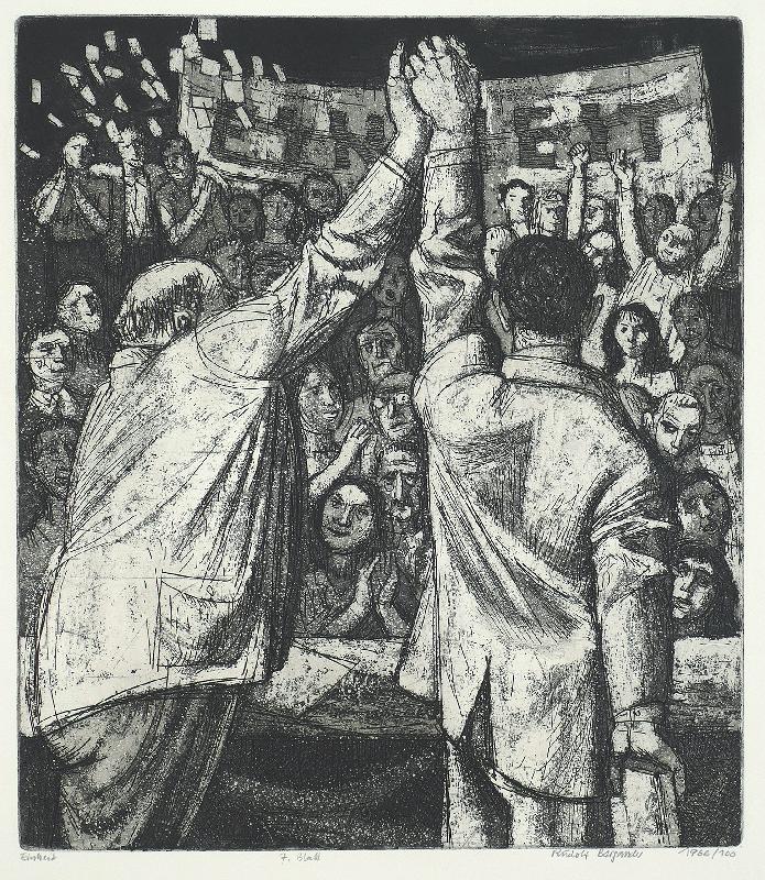 Spannung zwischen Polaritäten Kaltnadel, 1924, Druck aus dem Jahr 1964, 302 x 370, von Lis Bertram-Ehmsen sign., dat., num. (Exemplar I), bez. (Maße) und betitelt. WV Lang 51 (hier: Gesellschaft). Leichte Druckfalten an den unteren Ecken. Beigabe: Trauernde Frauen, Holzschnitt, 162 x 122, 1909/64, von Lis Bertram-Ehmsen sign., bez. (D 64), betitelt, WV Lang 22.