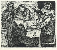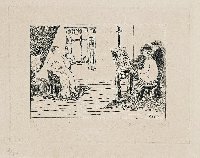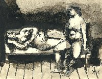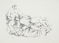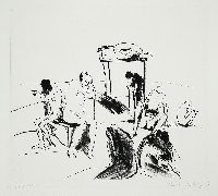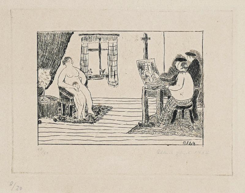 Maler bei der Arbeit (Aktzeichnen) Kaltnadel in Braunschwarz, 1964, 165 x 220 (Platte), sign., dat., num. (18/20 sowie 8/20), verso: Beschriftung von fremder Hand. WV Brade/Stula R 11. Tadelloser Druck aus der 1. Auflage.