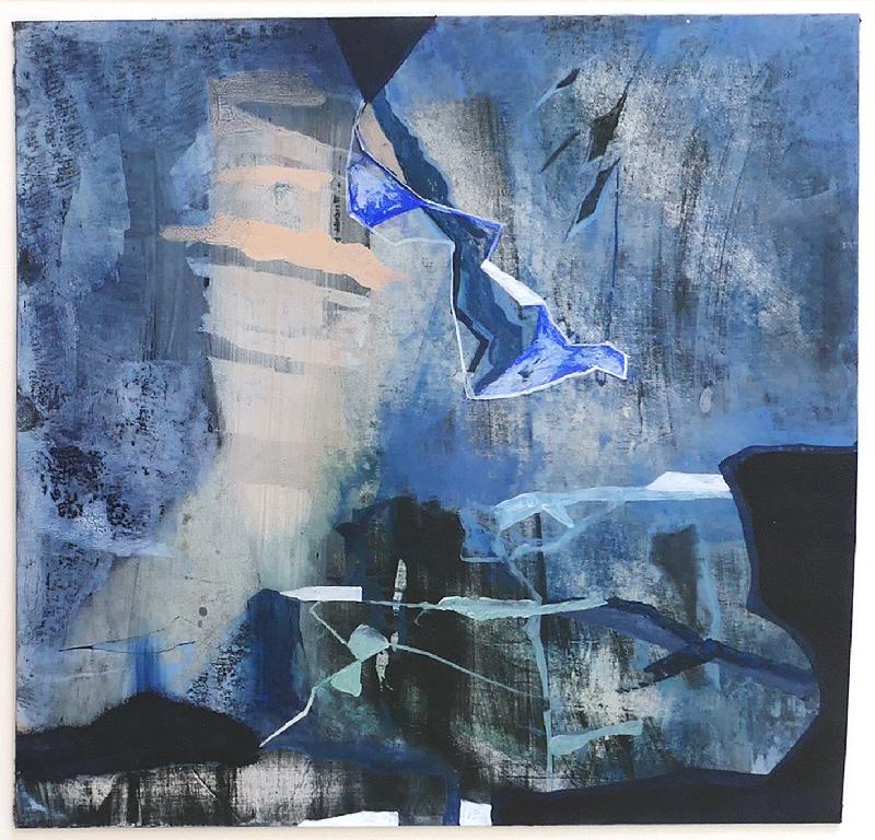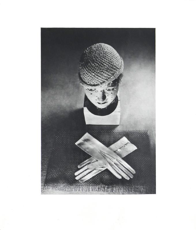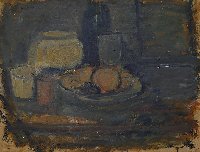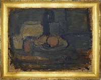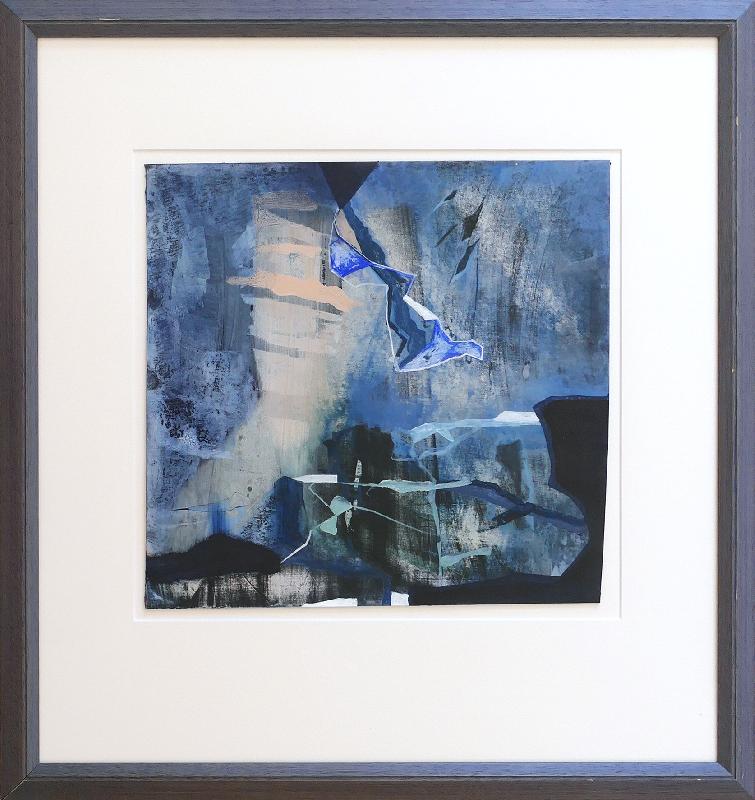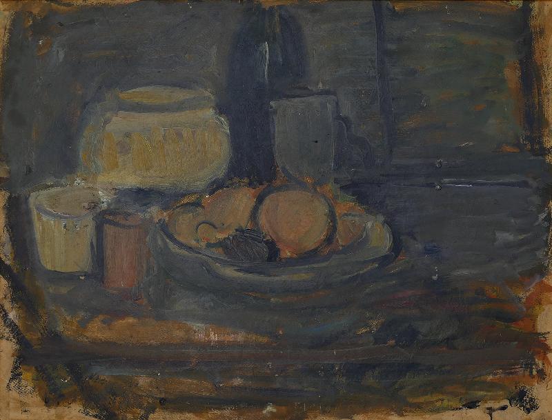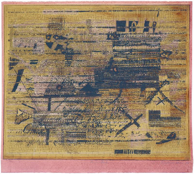 (Stilleben mit goldenem Pokal) Collage, verschiedene Papiere, teils übermalt mit Farbstiften und Feder/Tusche, montiert auf Papier, 147 x 207, mon. Freistehend in ein Passepartout montiert. Papier etwas wellig.
