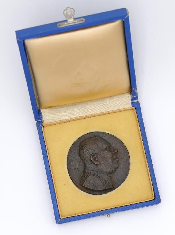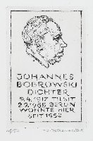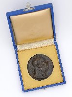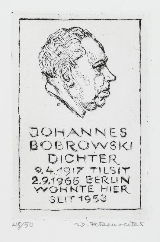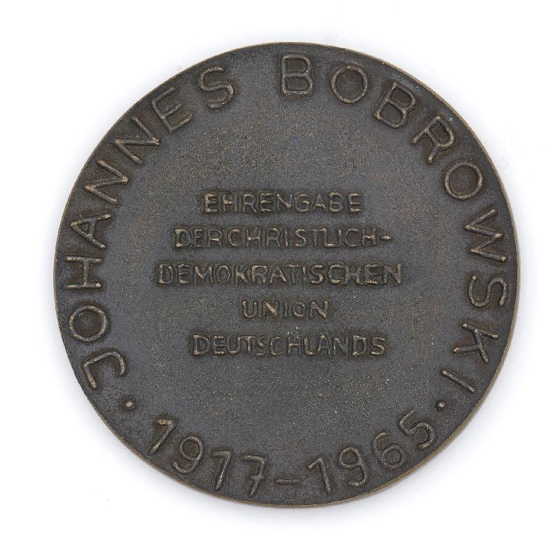 Portraitmedaille Johannes Bobrowski Bronze, 1968, d: 65 mm (kreisrund), unsign., verso: bez. (Johannes Bobrowski 1917-1965, Ehrengabe der Christlich-Demokratischen Union Deutschlands). In blauer Schmuckschatulle, diese mit Gebrauchsspuren. Abgebildet in: W.F. Portraitplastiken, Marbach 2000, S. 161. WV A. Förster 48. Auflagenhöhe unbekannt. Provenienz: Nachlaß des Dichters Johannes Bobrowski. Beigabe: 2 Portraits von Johannes Bobrowski, sign. und num. Radierungen von Wilfried Fitzenreiter (Papierformat: jeweils 224 x 153).