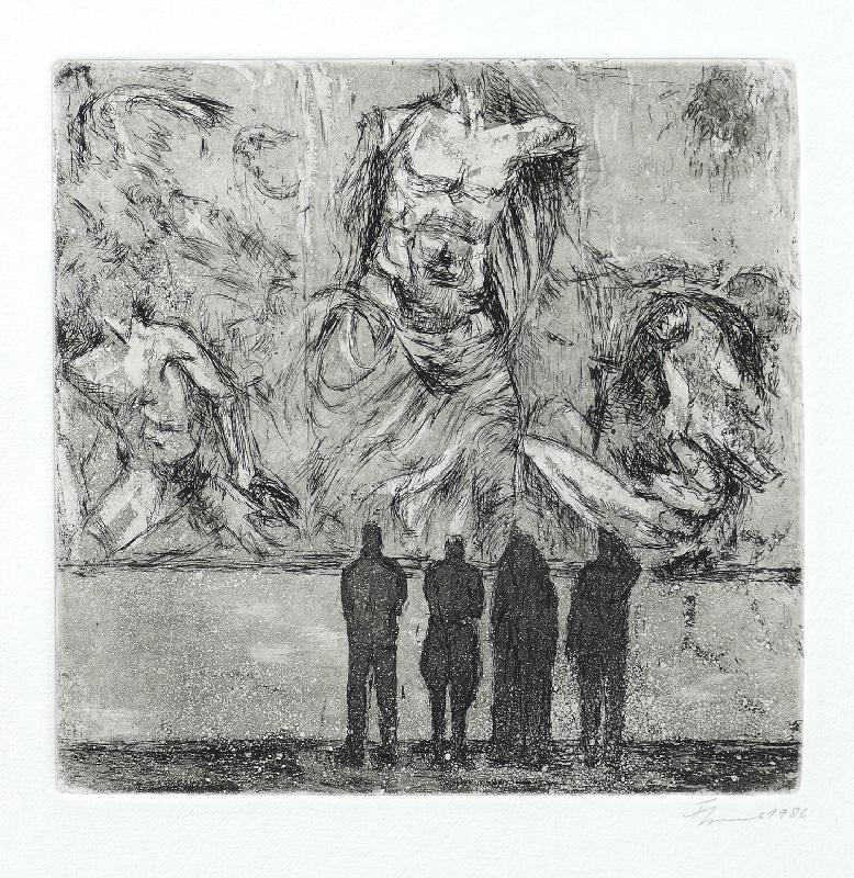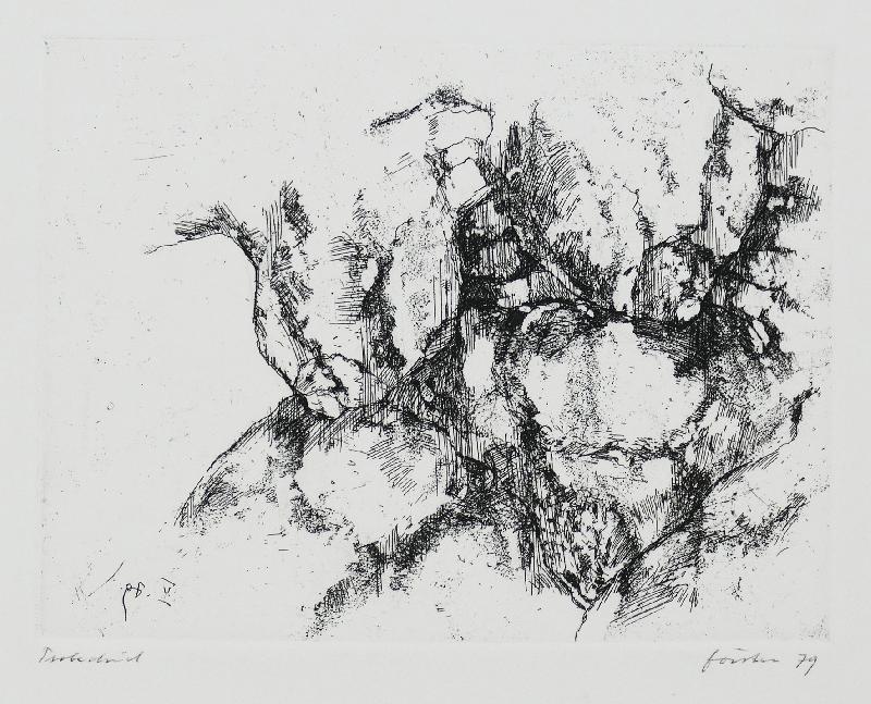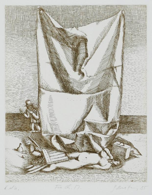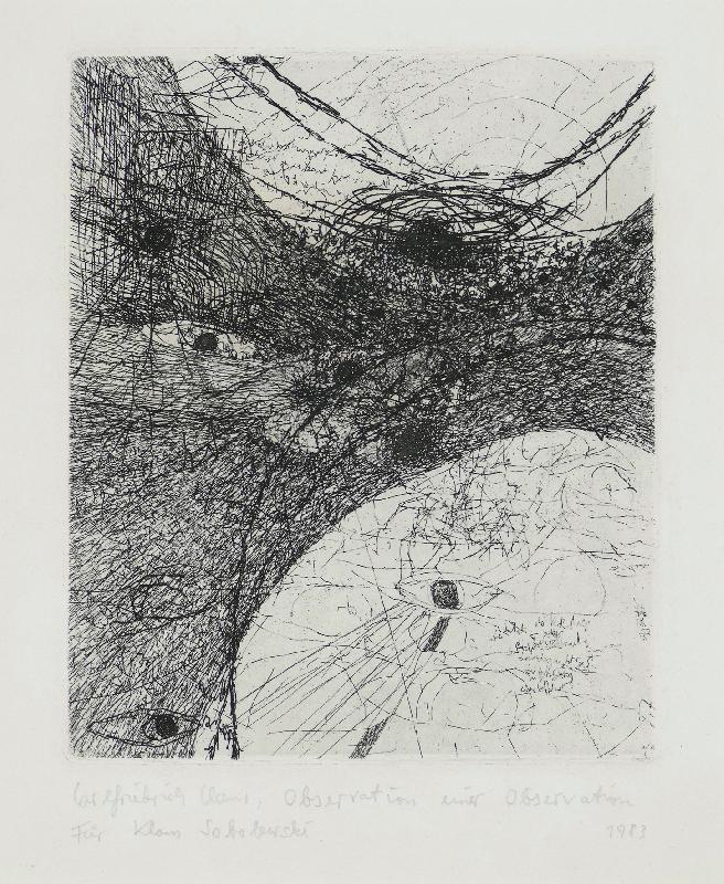 Einblick in Paar Radierung auf Kupferdruckpapier, 1979, 213 x 194 (Papierformat: 391 x 365), sign., dat., bez. (Probedruck), mit handschriftlicher Widmung des Künstlers, in der Platte spiegelverkehrt dat (V.79). WV SKH 192. Sehr gut erhalten.