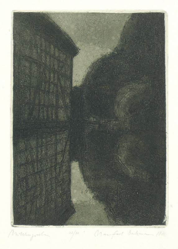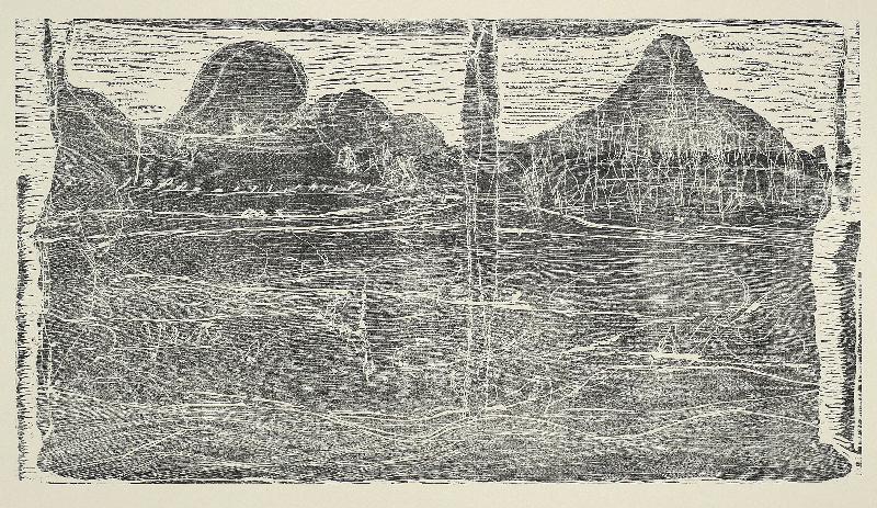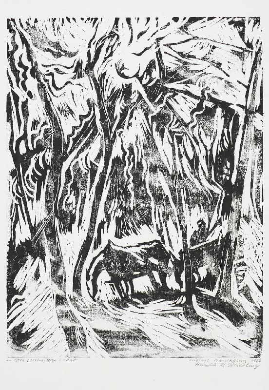 Verschlungene Wege im Tal der Häher Holzschnitt auf gelblichem Bütten, 1977, 353 x 640 (Papierformat: 573 x 860), sign., mon., dat., num. (8/10), betitelt, Trockenstempel des Künstlers. WV G. Schmidt H 200, 1. Variante. Druck von einem 150 Jahre alten Mühlenstempel aus Eichenholz. Geringfügig fingerspurig, sonst sehr gut.