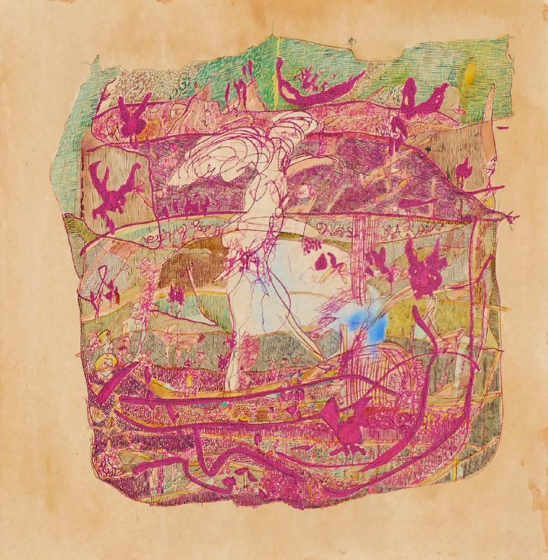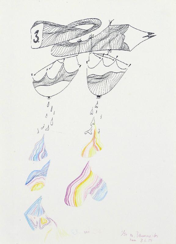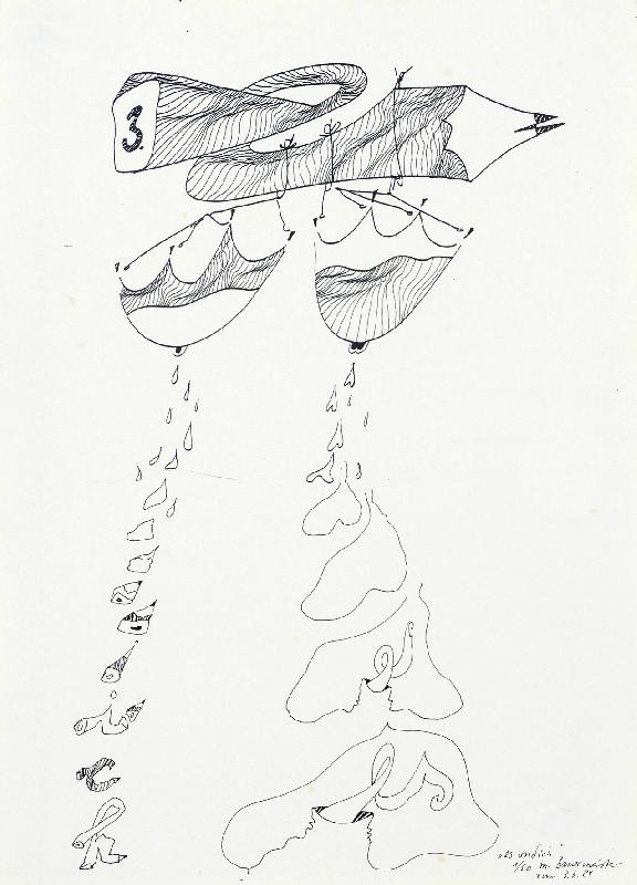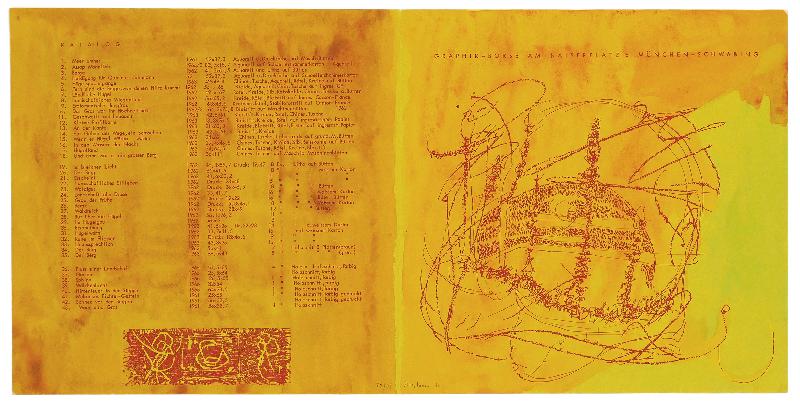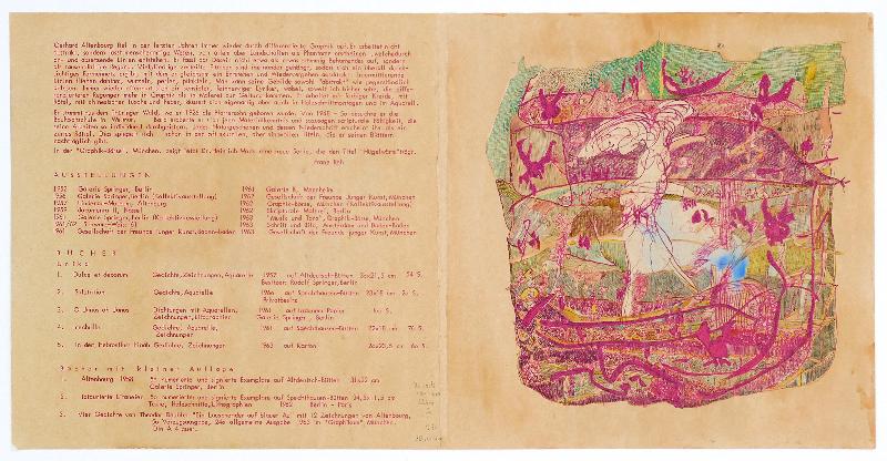 Da sucht einer einen kleinen See Chinesische Tusche, Feder, Aquarell über Kleinoffsetdruck in Rot nach der Zeichnung "Kopflandschaft", 1970, 208 x 207 (Papierformat: 210 x 418), sign., dat., betitelt, Trockenstempel des Künstlers, verso: ein weiterer, leicht aquarellierter Offsetdruck, nochmals sign., dat. und bez. (70/34 [WV-Nr.]). Übermaltes Faltblatt mit Einladung und Verzeichnis zur Ausstellung "Hügelwärts", Graphik-Börse, München 1963. WV Janda 70/34. Seltenes Unikat! Insgesamt existieren nur vier Übermalungen dieses Faltblatts. Tadelloser Zustand.