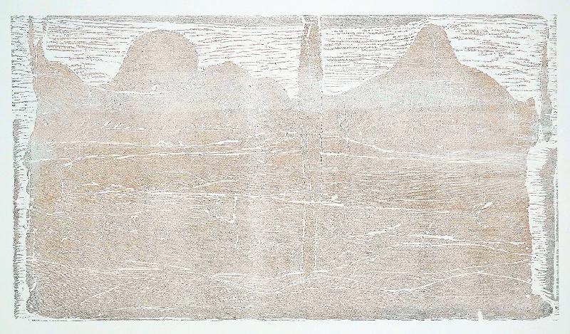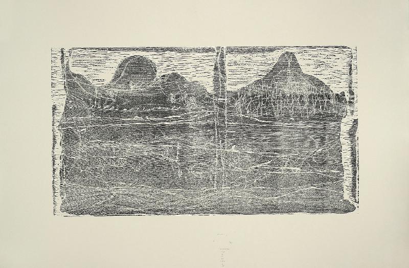 Gesammeltes Schweigen Farbholzschnitt in Rotbraun und Grau auf AD Hahnemühle-Bütten, 1977, 353 x 640 (Papierformat: 555 x 750), sign., mon., dat., num. (2/3), bez. (Andruck), betitelt, Trockenstempel des Künstlers. WV G. Schmidt H 200, 2. Variante. Druck vom selben Holzstock wie Kat.-Nr. 13. Hervorragender Zustand.