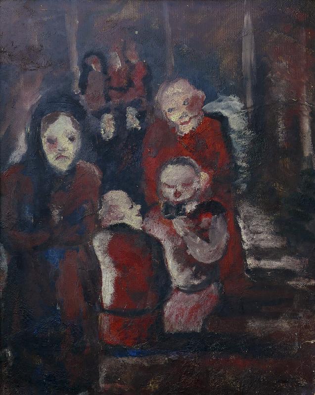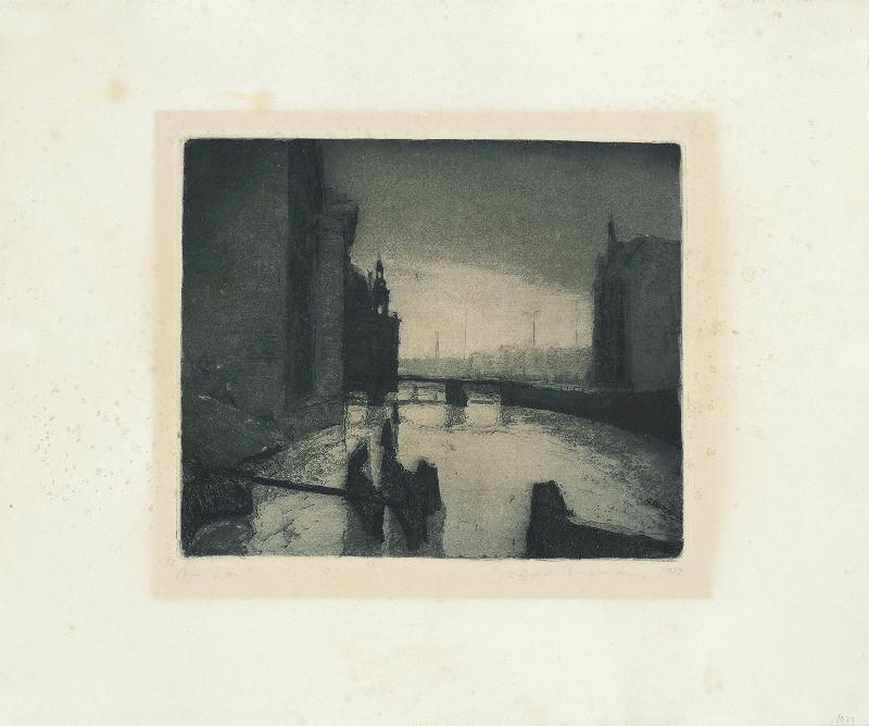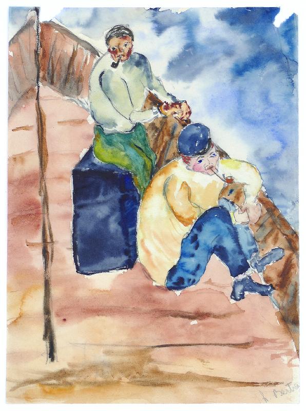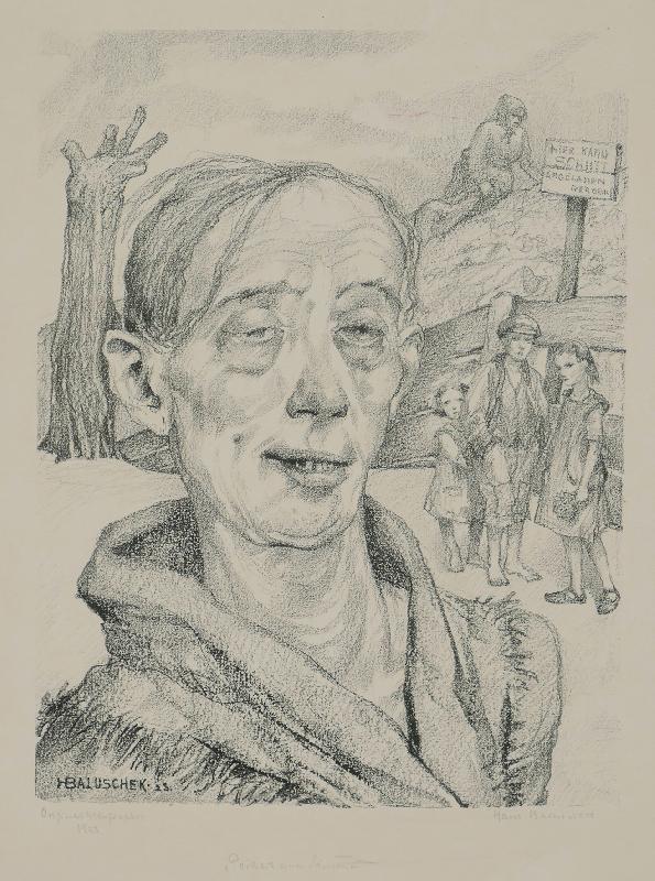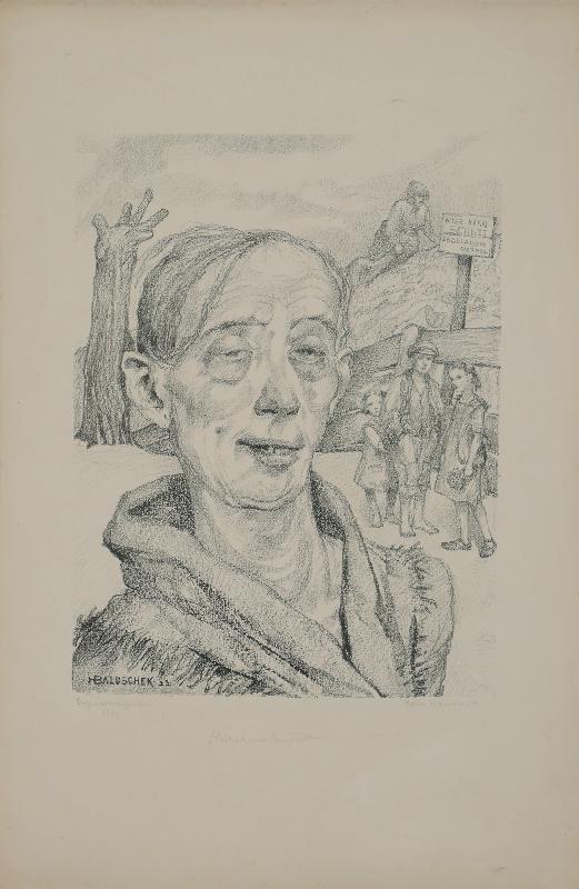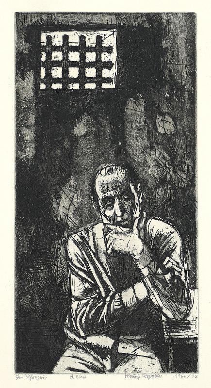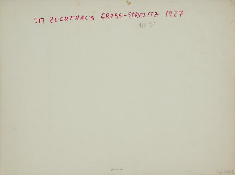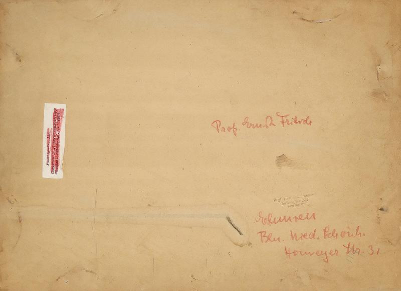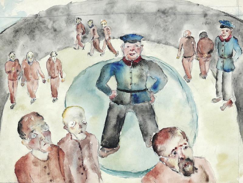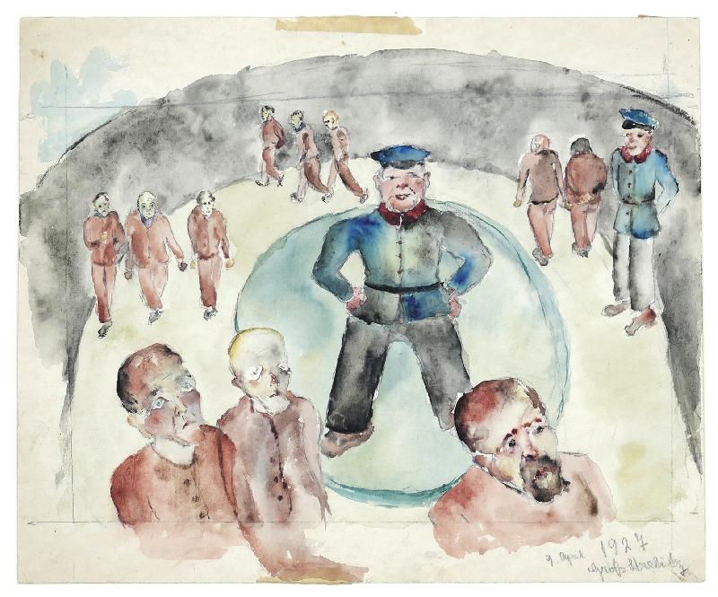 Im Zuchthaus Groß-Strelitz Aquarell, 1927, 243 x 293, dat. (9. April 1927), betitelt. Unter Passepartout montiert, dort verso (von fremder Hand?) dat., bez. (Nr. 30 [Ausstellungsnummer?]) und betitelt. Kleiner Einriß am rechten Blattrand sowie Klebespuren einer früheren Montierung (vom Passepartout verdeckt).