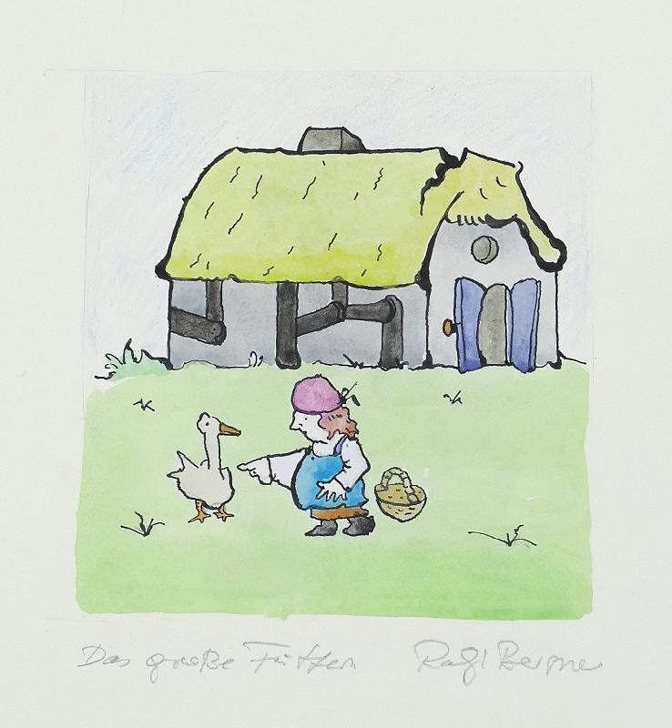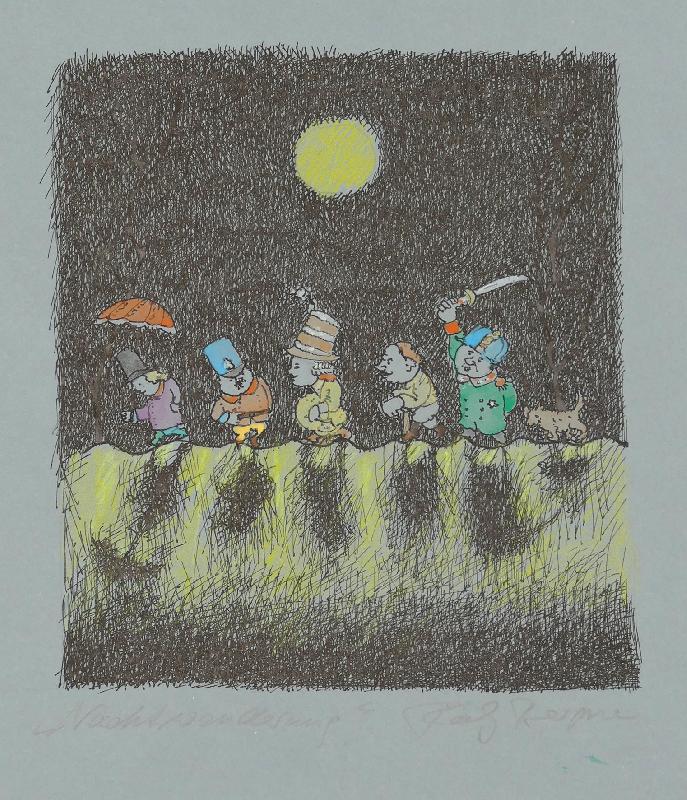 Auch ein Turnstündchen - und die Abseitige Lithographie, Steinritzung auf grünlichem Hahnemühle-Bütten, 1971, 240 x 292 (Papierformat: 311 x 484), sign., dat., num. (2/2), bez. (Andruck), betitelt, Trockenstempel des Künstlers. WV Janda L 154, II. Zustand. Marginale geglättete Knickspur an der linken oberen Ecke, sonst sehr guter Zustand.