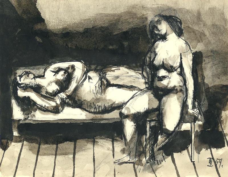 Ebert, Albert Maler bei der Arbeit (Aktzeichnen) (Kaltnadel in Braunschwarz - 1964)