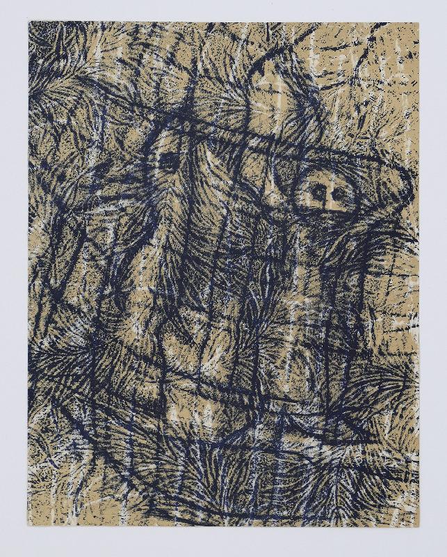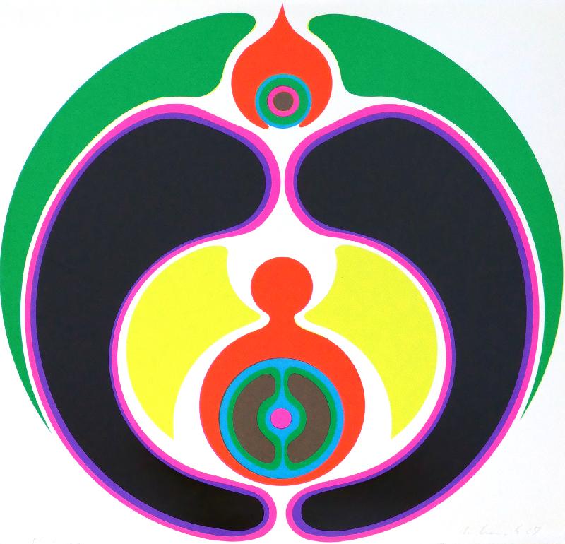 Altenbourg, Gerhard [i.e. Gerhard Ströch] Herauftauchend aus Animas Schoß (Farbholzschnitt in Olivgrün, Orange, Blau und Schwarz von vier Stöcken - 1969)