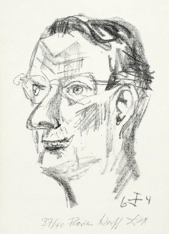 Wund-Denkmale. Schwebende Labung und Schauer. Künstlerbuch, Halbpergamentkassette mit der Orig.-Zeichnung: Komm, komm, hinab in den Orkus der Abhängigkeit, Wachsmalkreiden, Litho-Kreide, Bleistift, Pitt-Kreide, Aquarell auf einem gefalteten Bogen Richard de Bas Handbütten, sign., mon., dat. und betitelt, Trockenstempel des Künstlers, WV G. Schmidt 79/90. Weiterhin sind enthalten: 28 blattweise sign. bzw. mon. Farbholzschnitte (davon 10 blattgroß, 2 Holzschnitte auf den Kassettendeckeln und 16 Holzschnittvignetten), ein unsign. Holzschnitt auf dem Rücken der Kassette und Texte des Künstlers. Im Impressum von Altenbourg sign., mon. und num. sowie eine kleine Einzeichnung und Trockenstempel des Künstlers. Format der Kassette: 310 x 325. Exemplar XVIII (von 50 + L). Mit einem Begleittext von Hans Marquardt. Herausgegeben von Hans Marquardt und Dieter Brusberg. Erster Druck der Dürer-Presse, Verlag Philipp Reclam jun., Leipzig 1986. WV G. Schmidt 82/83. Es erschienen L Exemplare bei Reclam, Leipzig und 50 Exemplare im Verlag der Galerie Brusberg, Hannover. Unser Exemplar stammt aus dem Besitz des Herausgebers Hans Marquardt. Die Holzschnitte und Texte der beiden Ausgaben sind nicht identisch. Die Gesamtgestaltung des Pressendrucks lag in den Händen von G.A., der an diesem Hauptwerk sechs Jahre lang arbeitete. Minimaler Einriß an der Unterkante der Zeichnung (außerhalb der Darstellung). Vereinzelt leichte Knicke im Seidenpapier zwischen den Graphiken, sonst sehr guter Zustand. Opus magnum in Altenbourgs graphischem Schaffen.