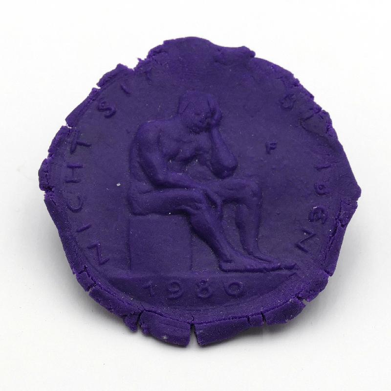 Nicht sitzen bleiben 1980 (Aufgestützt sitzender Mann), Medaille, violettes Plastilin, d: 65, WV 79.16 |
