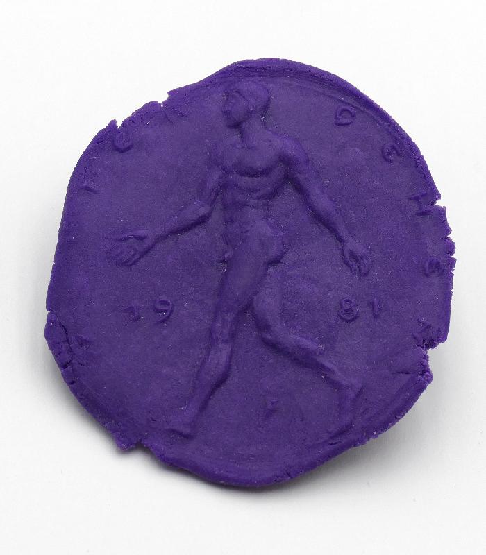 Weiter gehen 1981 (Schreitender Mann), Medaille, violettes Plastilin, d: 65, WV 80.10 |