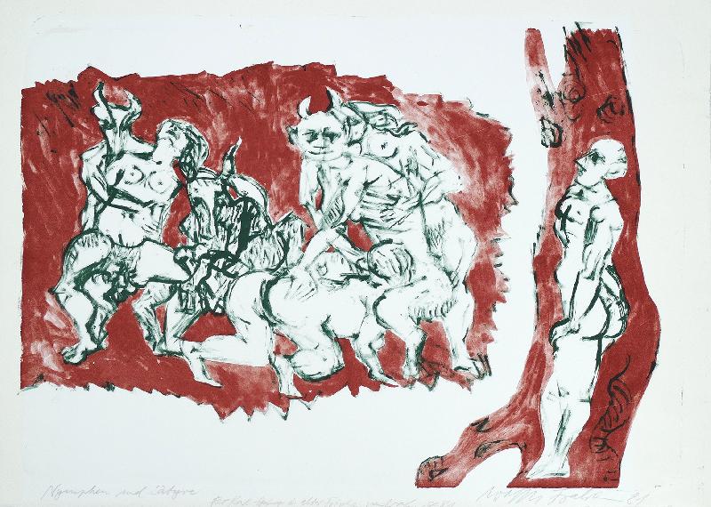 Nymphen und Satyre Farblithographie auf Hahnemühle-Bütten, 1981, 377 x 517, sign., dat., betitelt, mit handschriftlicher Widmung des Künstlers. Knick an der unteren rechten Ecke, sonst sehr gut.