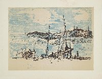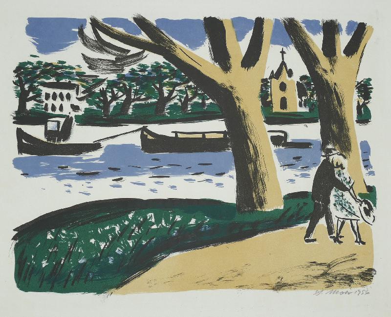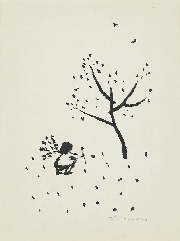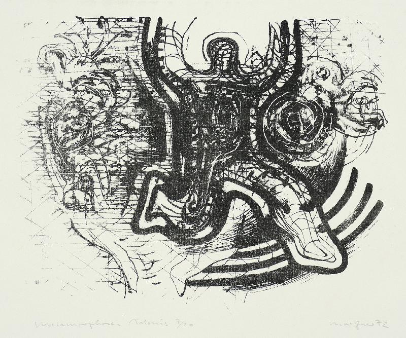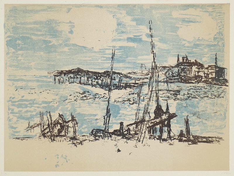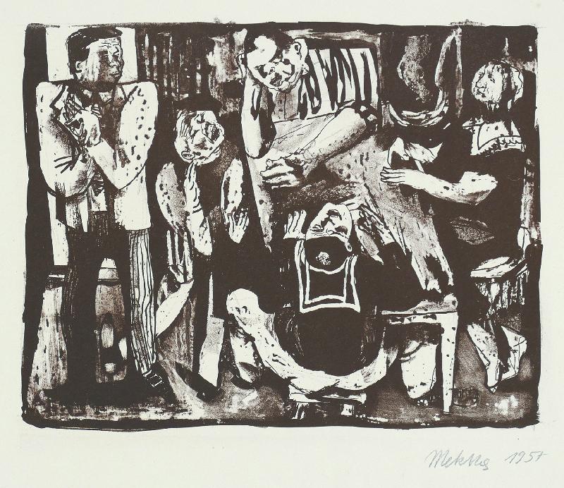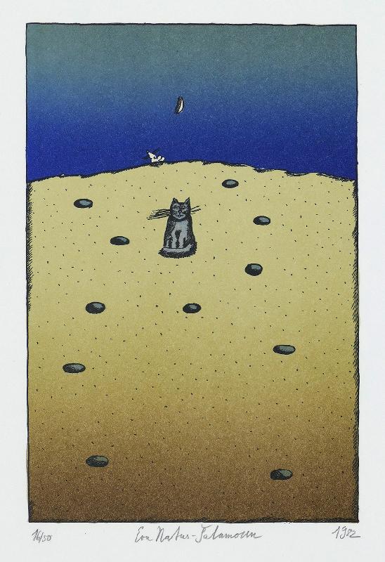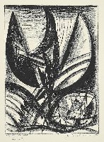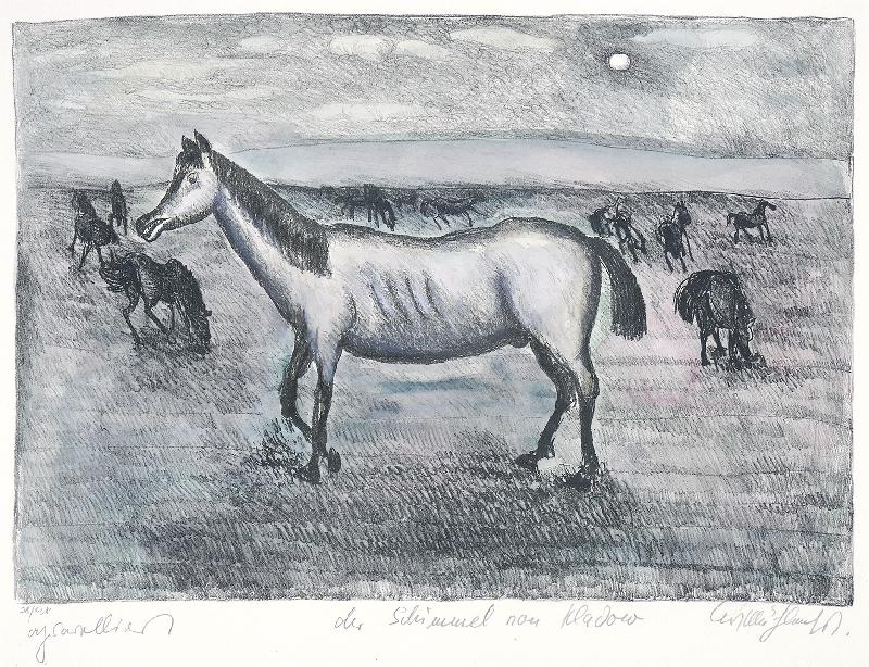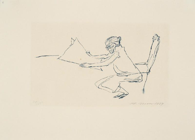 Kamminke Farblithographie in Braun und Blau auf beigem Fond, 1964, 308 x 408, mon., dat., num. (11). WV Schmidt/Sohler/Lau 36. Am oberen Blattrand bräunlicher Fleck (außerhalb der Darstellung), sonst gut erhalten.