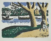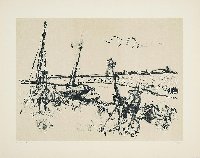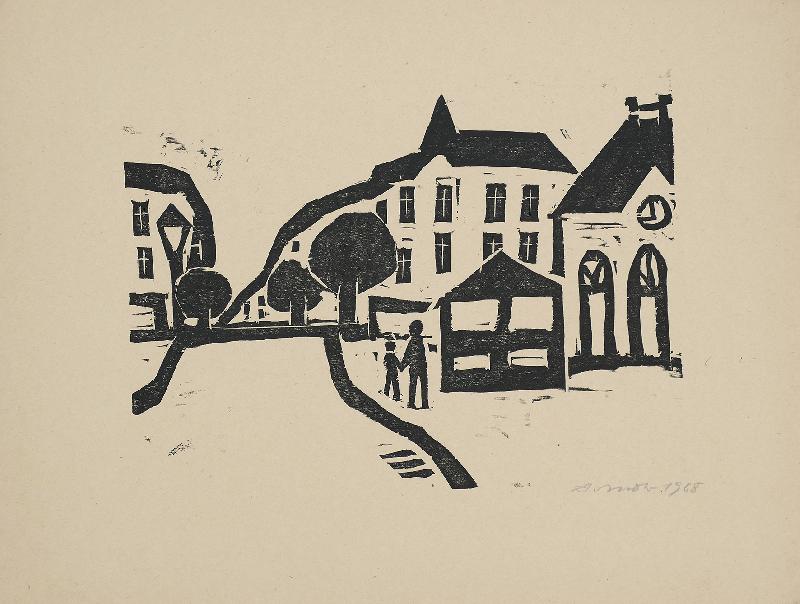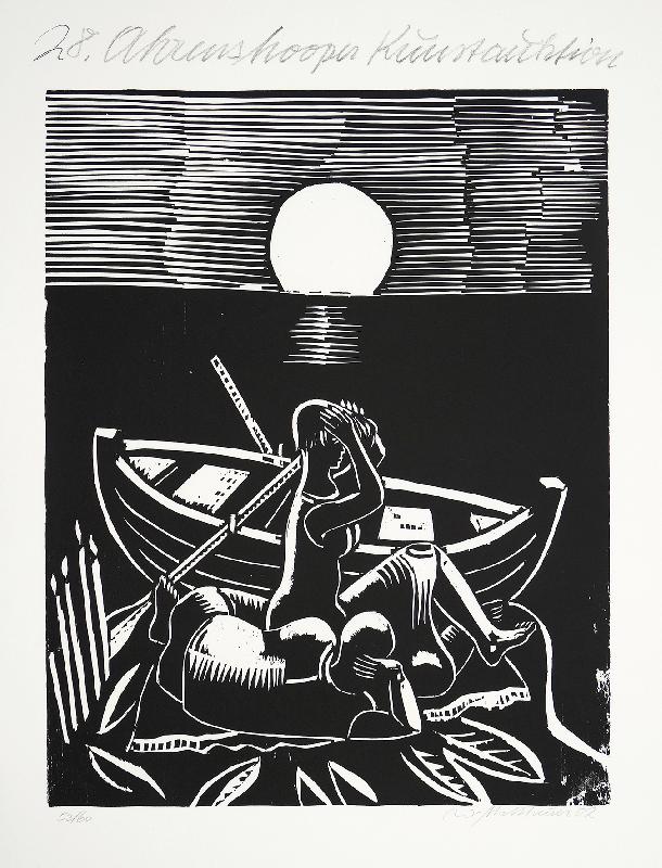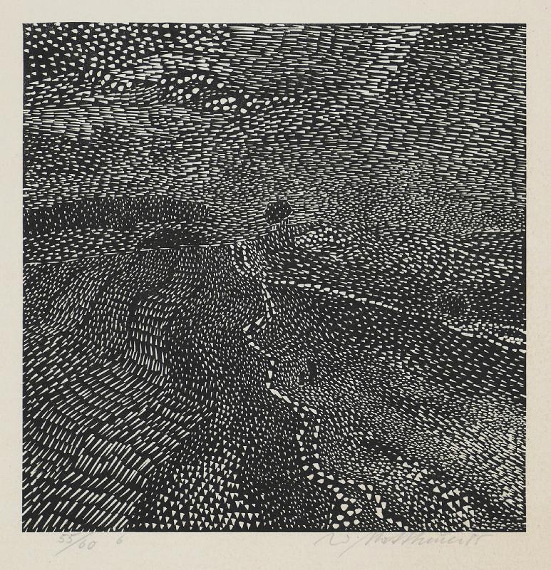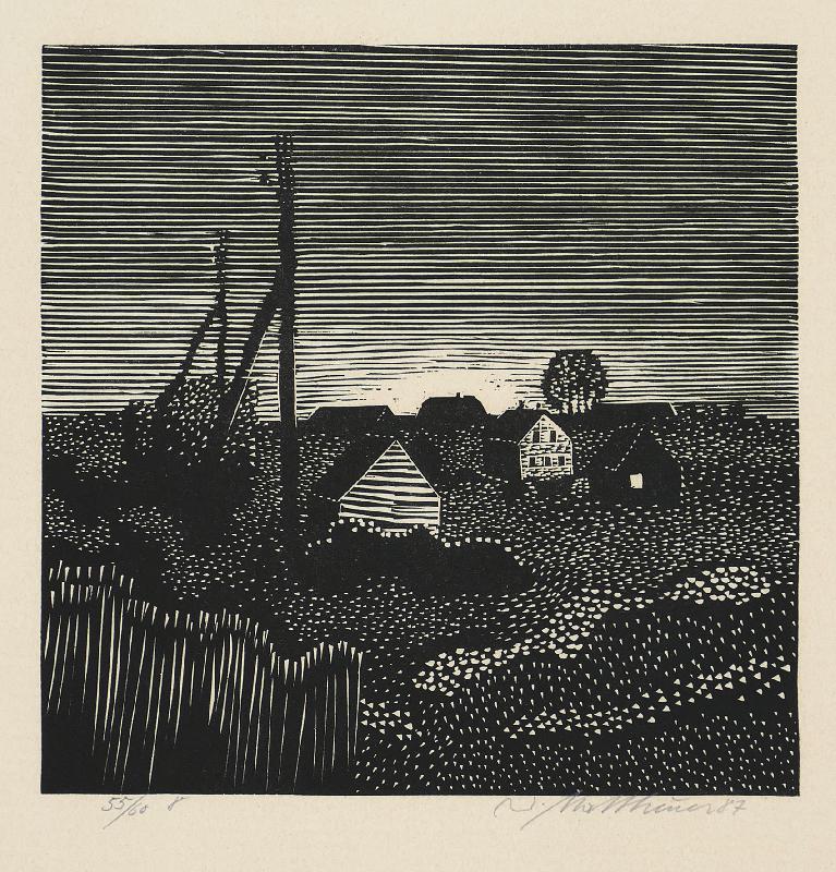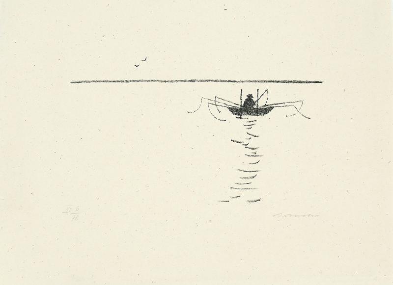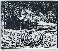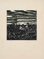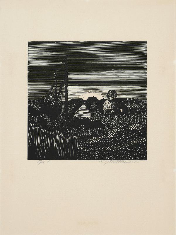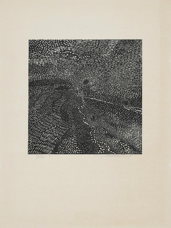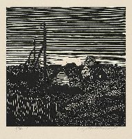 Dämmerung Linolstich, 1980, 580 x 778, sign., dat., num. (28/30), betitelt. WV Koch/Gleisberg/Seyde 242. Das Papier altersbedingt gebräunt und mit unauffälligen braunen Sprenkeln. Schmaler Lichtrand oben und unten.