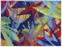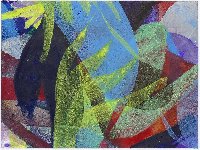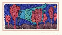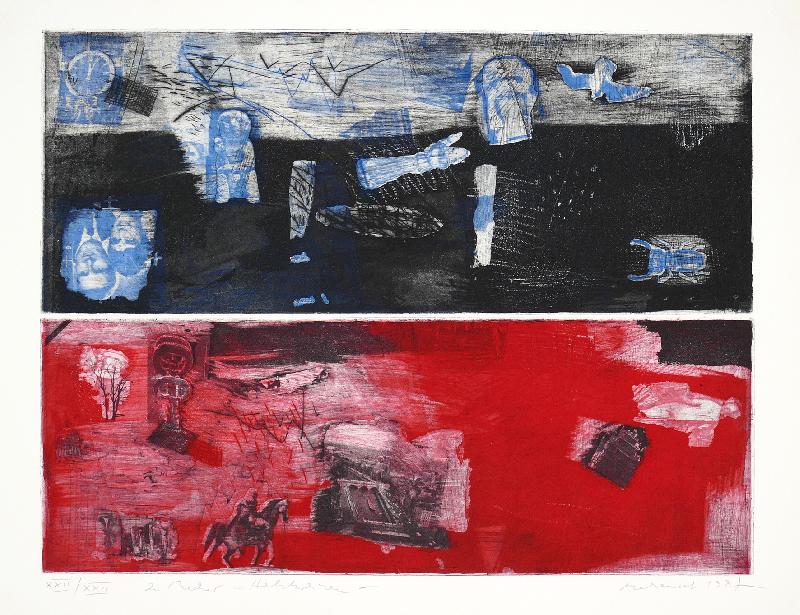 Herbstweisen, Farbradierung in Blau, Rot und Schwarz von zwei nebeneinander gedruckten Platten |