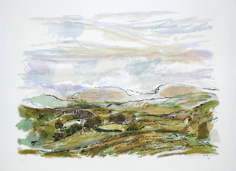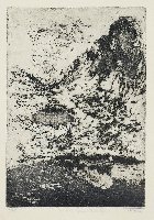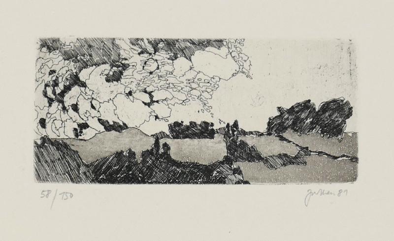 (Elbsandsteingebirge) Radierung auf getöntem Bütten, 1982, 99 x 165, sign., dat., num. (7/16). Beigabe: Landschaft mit großer Wolke, Radierung, 1981, 50 x 105 (Papierformat: 240 x 300), sign., dat., num. (58/150), Trockenstempel des Staatlichen Kunsthandels, WV SKH 257.