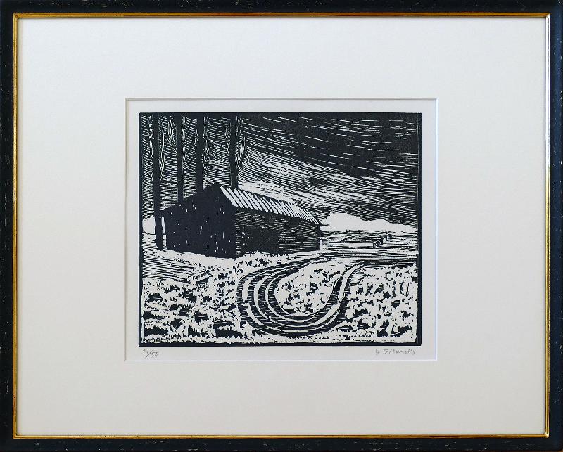 Wagenspur Holzschnitt, 1967/68, 247 x 296, sign., num. (31/50). Unter Passepartout montiert, nobel unter Glas gerahmt (ungeöffnet). WV Lammek H 423.