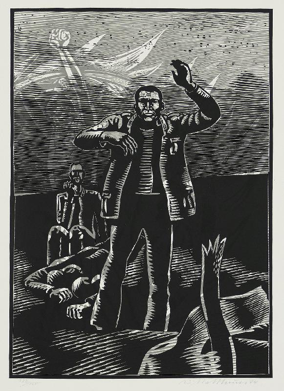 Deutscher Mai - 1945 Holzschnitt in Grau und Schwarz von zwei Stöcken, 1974, 395 x 280, sign., dat., num. (139/150). WV Koch/Gleisberg/Seyde 202 III. Fachmännisch restaurierter Einriß an der rechten unteren Ecke und schwach lichtrandig - beides weit außerhalb der Darstellung.