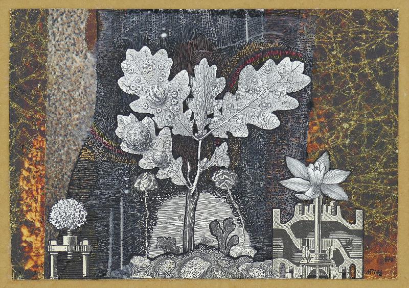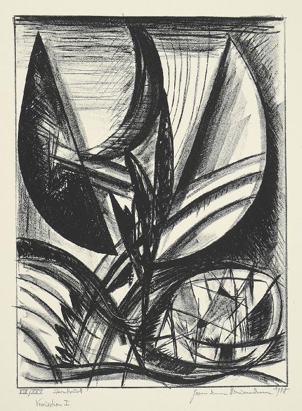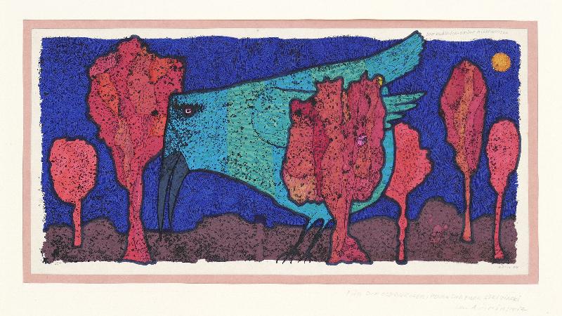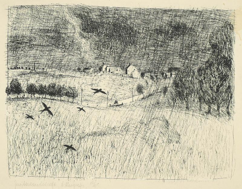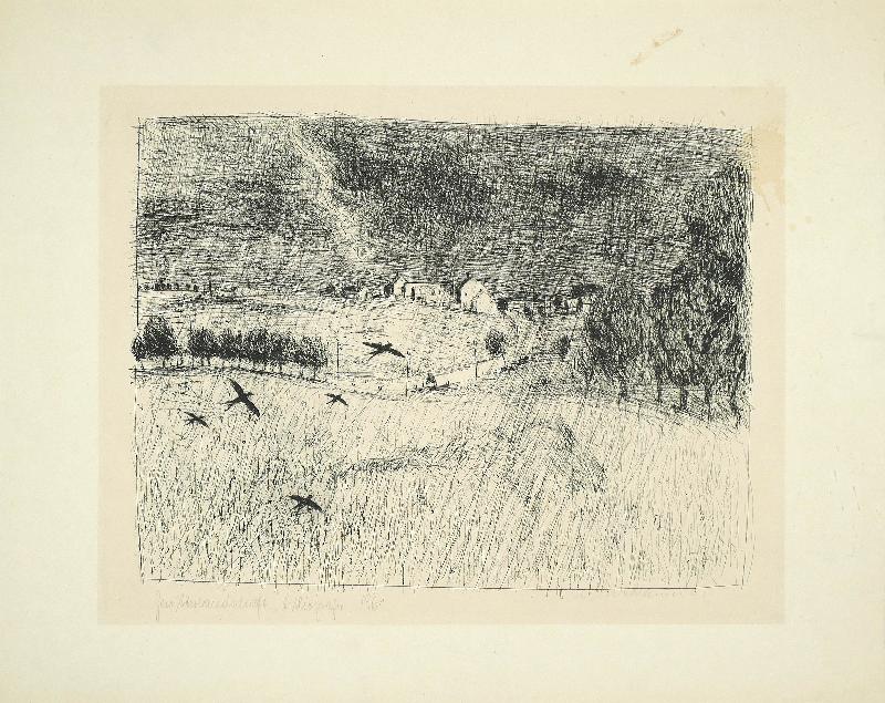 Gewitterlandschaft Lithographie (Kratzgravur), 1961, 335 x 432, sign., von fremder Hand dat., bez. (Technik) und betitelt, verso: vom Künstler bez. (Name, Adresse, Titel) sowie von fremder Hand bez. Unter Passepartout montiert, unter Glas gerahmt. WV Koch/Gleisberg/Seyde 97 (hier: Gewitterlandschaft mit Vögeln). Seltene frühe Graphik des Künstlers. Das Papier ist im Passepartoutausschnitt stark gebräunt. Mehrere Flecken und Spritzer (wohl Kaffee), teils auch in der Darstellung (rechte obere Ecke), fingerspurig.