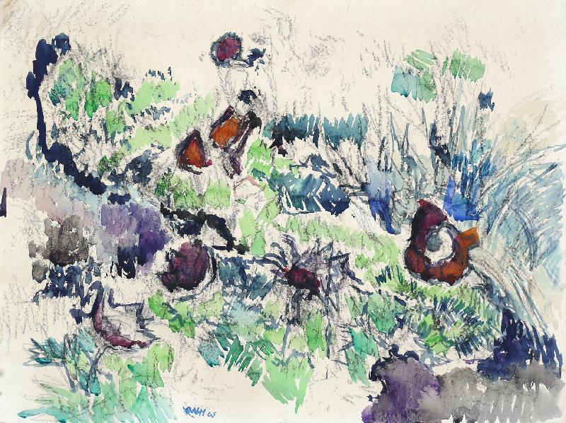 (Blumenwiese) Zeichnung, Kohle, Aquarell auf gehämmertem Papier, 1965, 357 x 477, mon., dat. Nicht im WV Soldner/Schmidt. Provenienz: Sammlung Wolfgang Langhoff. Das starke Papier durch die Feuchtigkeitseinwirkung beim Aquarellieren etwas wellig. Unauffälliger Knick mit kleinem Einriß an der Ecke unten rechts.