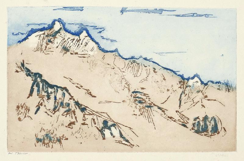 Hohe Tatra Farbradierung in Braun und Blau, 1965, 196 x 310, mon., dat., mit handschriftlicher Widmung des Künstlers für Wolfgang Langhoff, vom Drucker bez. Einer von nur 15 farbigen Drucken dieser Radierung. WV Schmidt/Sohler/Lau 97. Der breite Papierrand etwas knickspurig und mit vereinzelten Stockfleckchen, insgesamt gut erhalten. Beigabe: Bergtal mit See, Radierung, 1966, 210 x 148, mon., dat., num. (9/25), handschriftliche Widmung des Künstlers, WV Schmidt/Sohler/Lau 103. Das Bütten etwas vergilbt und ein brauner Fleck am rechten Rand, weit außerhalb der Darstellung.