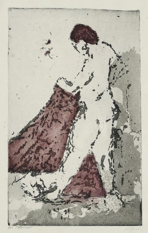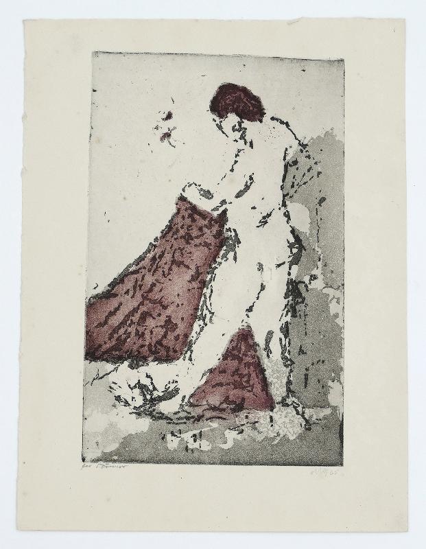 Stehender Akt mit Tuch Farbradierung in Rot und Schwarz, 1963/65, 268 x 168, mon., dat. (65), vom Drucker bez. (fec. Drescher). WV Schmidt/Sohler/Lau 92.