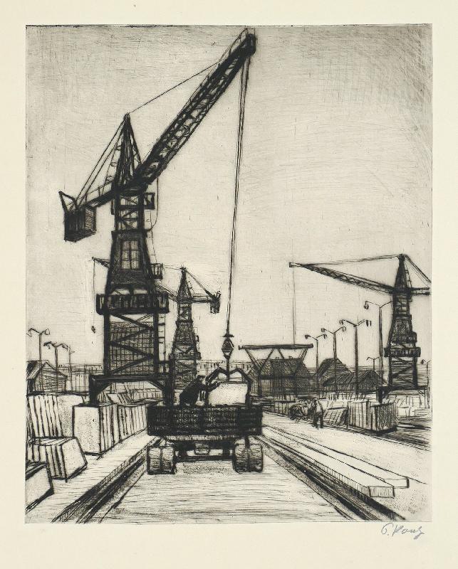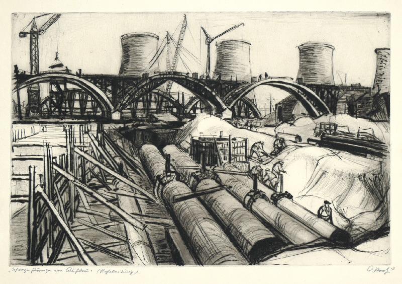 Konvolut von vier Radierungen Enthalten sind: LPG Merxleben (213 x 440), Genossenschaftsbauer von der LPG "Walter Ulbricht" Merxleben (315 x 265), Schwarze Pumpe im Aufbau (Rohrleitung) (320 x 485) & Bauplatz mit Kränen (335 x 273). Blattweise sign., verso von fremder Hand bez. Die Radierungen sind außerhalb der Darstellung teilweise etwas fleckig.